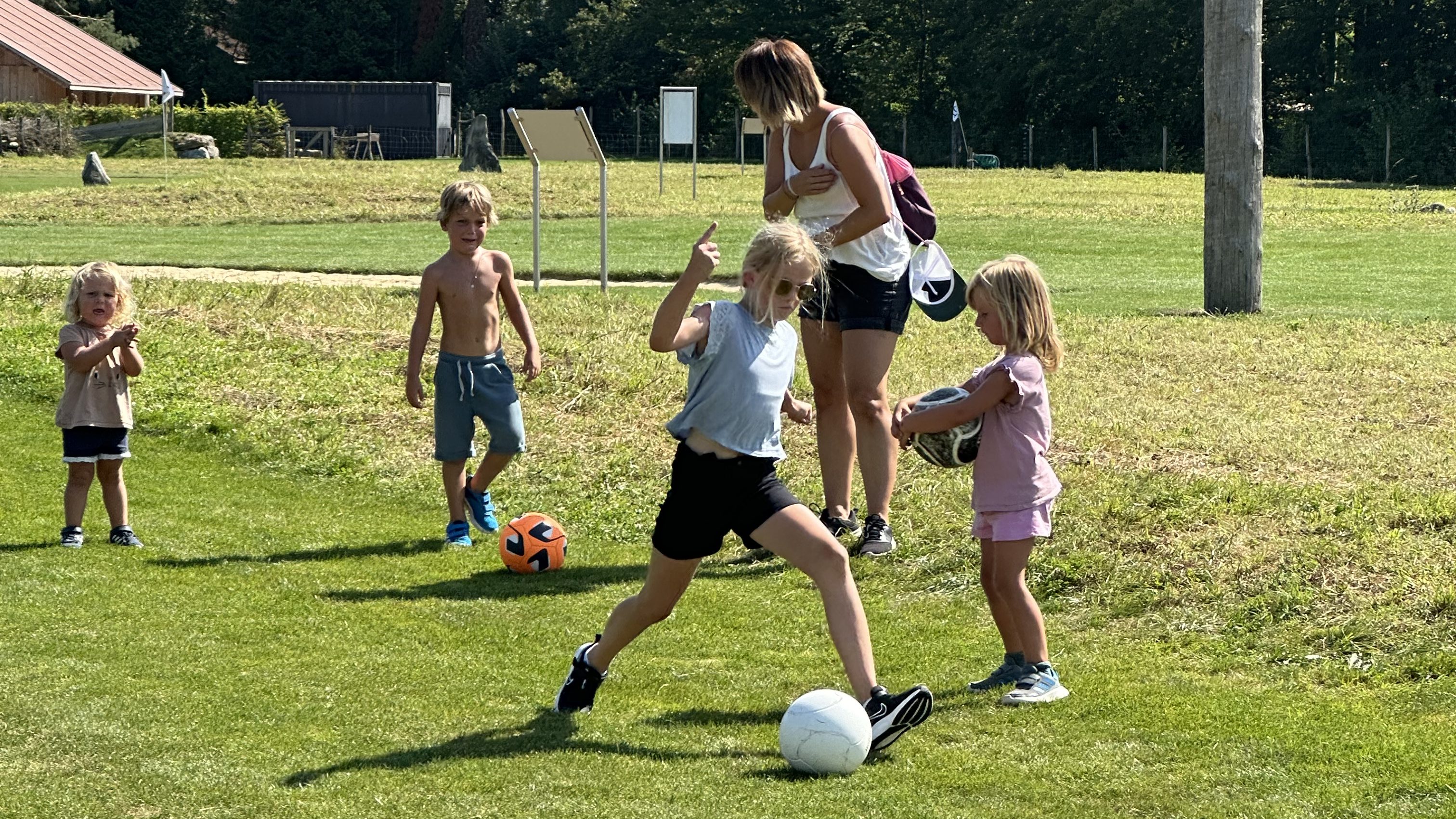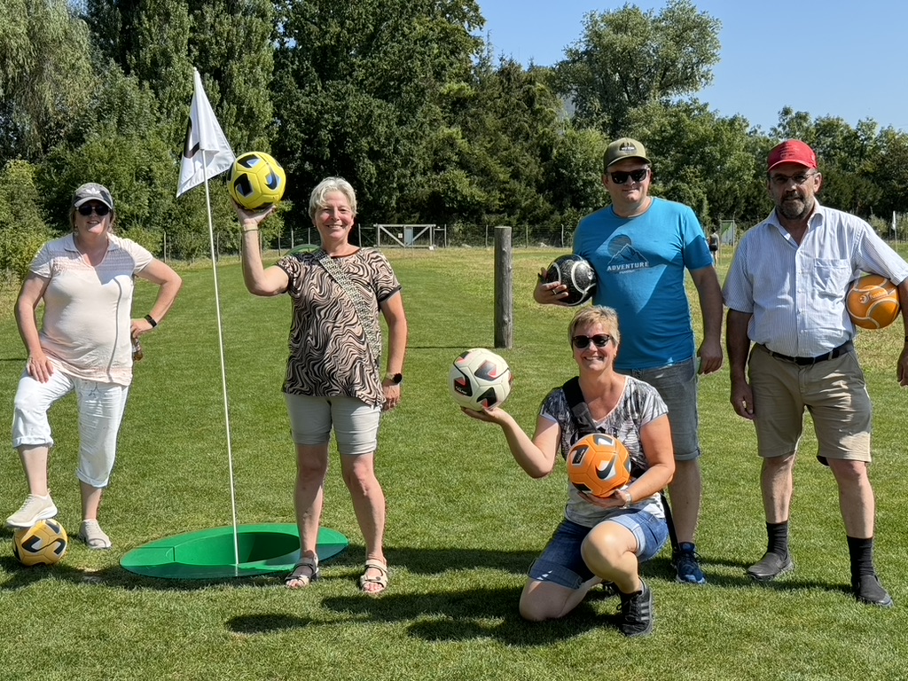 Nun zum sportlichen Teil: Bei nicht gerade fussballfreundlichen 30 Grad ab zur Fussballgolfanlage Müllheim. Die von der TKB zum 150 jährigen Jubiläum realisierte Anlage ist ein Freizeitvergnügen für jung und alt…also genau passend für den Dorfverein…