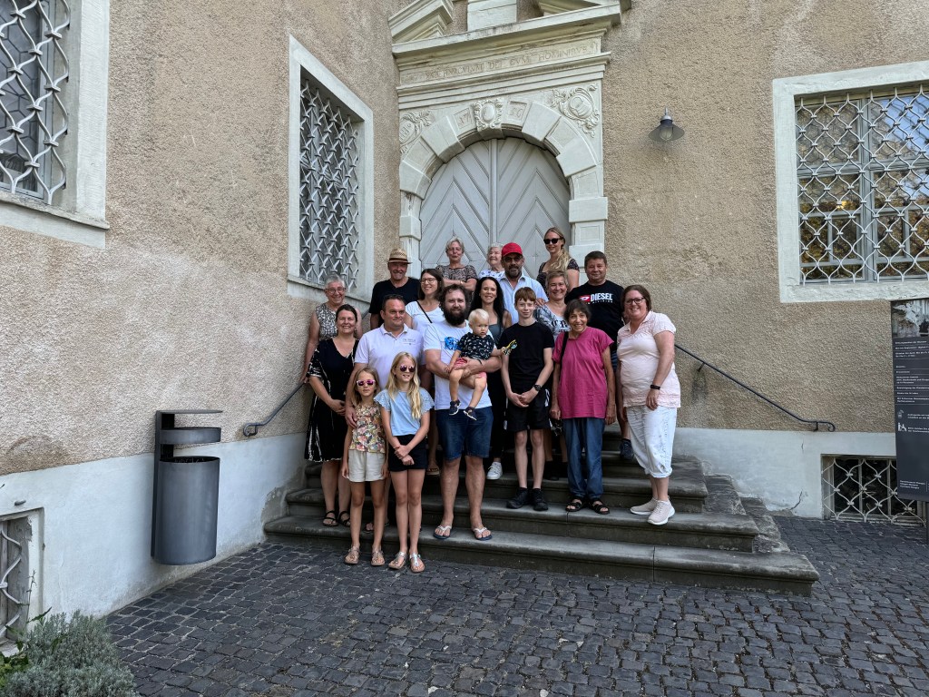 Mit den Privatautos, beladen mit Kind und Kegel, führte unsere Rundreise zuerst zur Kartause Ittingen. Auf der Treppe vor dem Eingang zum Museum noch ein Gruppenfoto im Schatten geschossen.